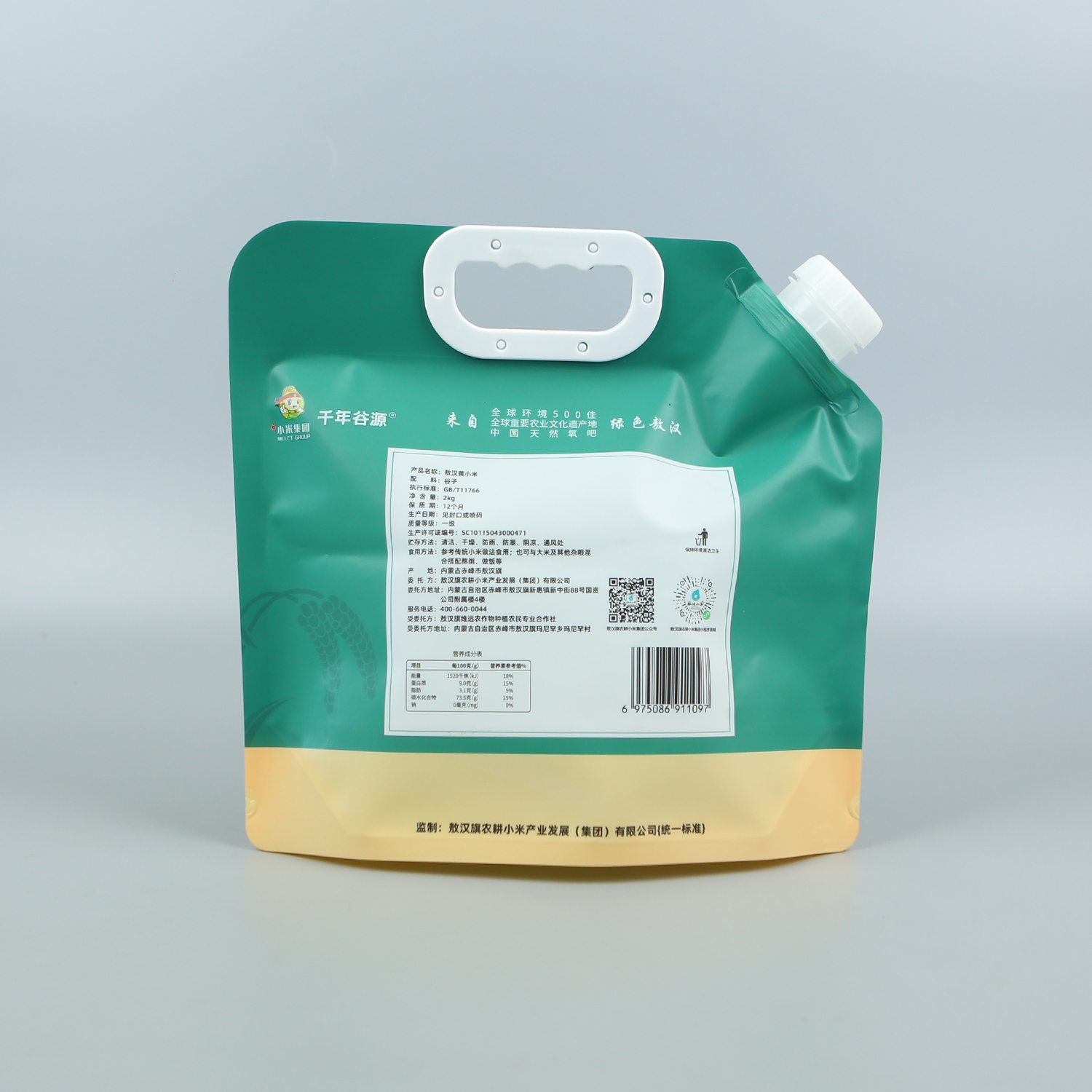 產品名稱:2kg黃小米袋+UV塑料復合+自立帶吸嘴