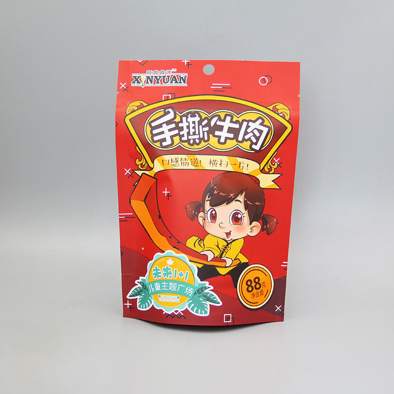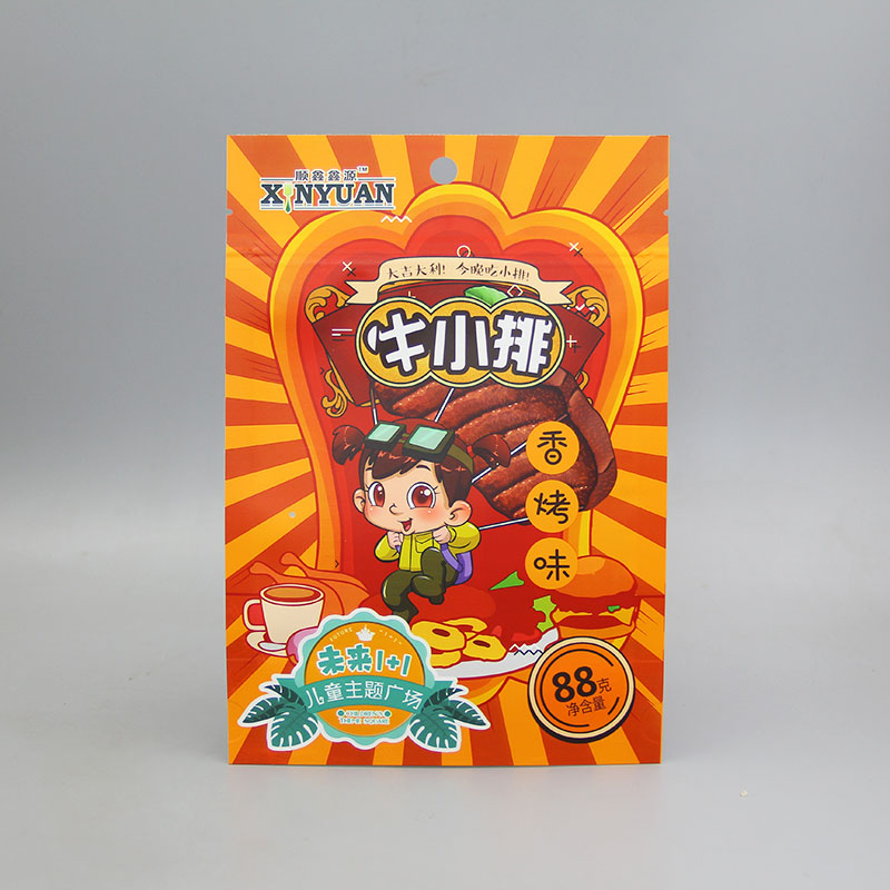 這是我們常見肉干類零食的包裝袋,由巨人紙塑包裝公司設計生產,雖然按照使用角度來說它只是名為“牛小排”的牛肉干包裝袋,但在我們紙塑包裝行業,它也可以稱為牛皮紙開窗袋、復合自立袋、自封包裝袋等等。
